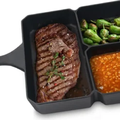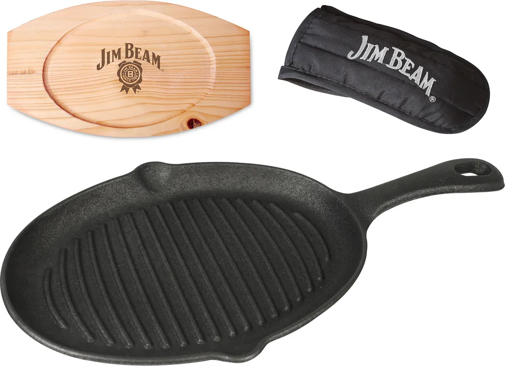 Jim Beam BBQ Servierpfanne Gusseisen – Grillpfanne Steakpfanne Emaille Mit Holzuntersetzer Servierbrett 4er Set