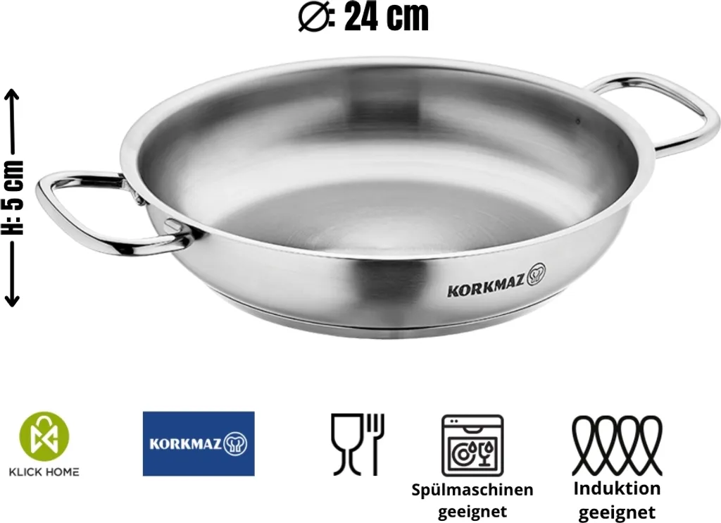 | Zusätzliche Varianten | Korkmaz Proline Edelstahlpfanne Induktion Edelstahl Frypan 16×3,8 cm A1151, Korkmaz Proline Paella Pfanne Induktion geeignet Omlet Sahan Omelett Bratpfanne Frypan 24 x 5 cm A1192, Korkmaz Proline Satin 16 cm Omelette Induktion / A1181 |